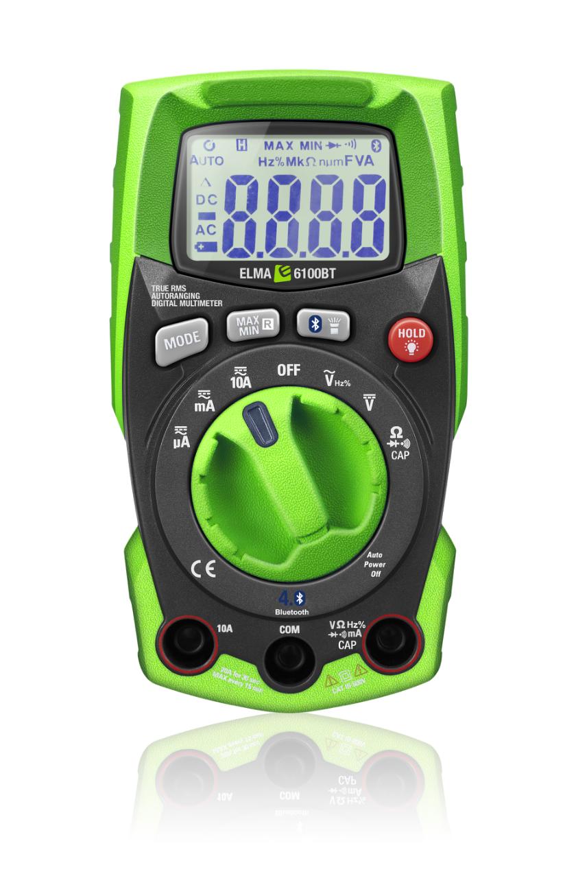 Elma 6100BT har stort belyst display og er udstyret med kraftig LED lommelygte, datahold max/min samt auto power off. Instrumentet opfylder EN61010-1 KAT III 600 V og leveres med prøveledninger, batterier og manual.