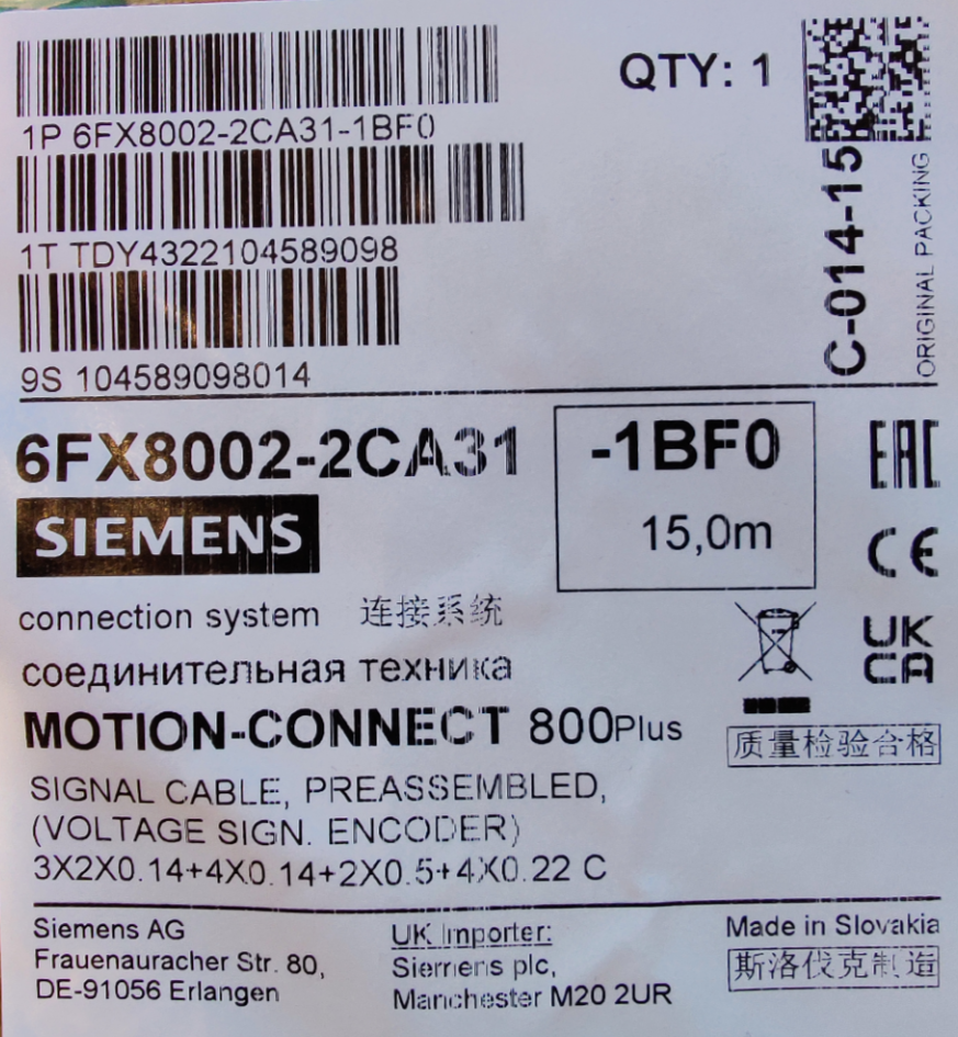 Signal cable pre-assembled for incr. encoder with C/D tracks integrated into the motor 3x (2x0.14) C+4x 0.14+2x0.5 +4x 0.22 C Connector full thread M23 MOTION-CONNECT 800PLUS trailable UL/CSA DESINA Dmax=9.8 mm Length (m)= TYPE: 6FX8002-2CA31